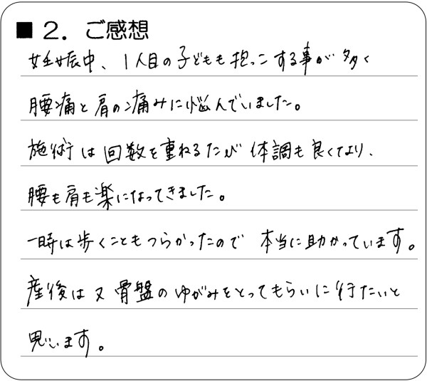 施術は体をかるくゆらしたり、腰の緊張をとってお腹のハリを軽くしたりしていきます。