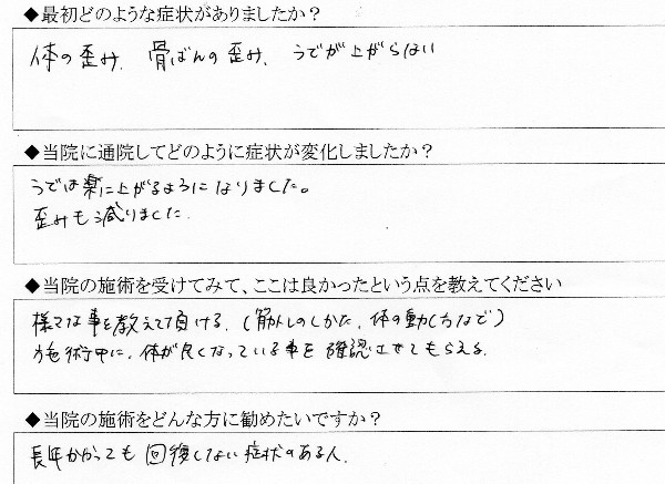 長年、ひざの不調があり、最近では両腕をあげるのが辛かったとのことです。