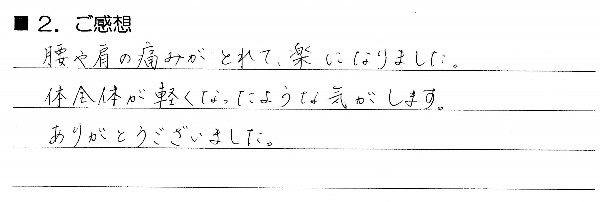 腰や肩の痛みがとれて、楽になりました。